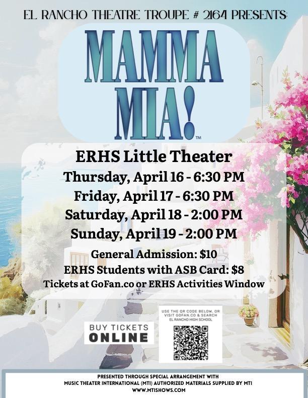 Momma Mia! Come watch and support the latest theater production! Spring Musical ....Momma Mia! Put on by El Rancho Theatre Troupe # 2164 Attached Files Mamma Mia! Flyer (1).pdf